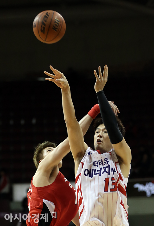 [안양=아시아경제 정재훈 기자] 24일 오후 안양실내체육관에서 열린 'KB국민카드 2013~2014 프로농구' KGC와 오리온스의 경기. 오리온스 김동욱이 슛을 쏘고 있다.