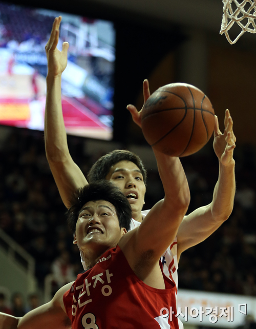 [안양=아시아경제 정재훈 기자] 24일 오후 안양실내체육관에서 열린 'KB국민카드 2013~2014 프로농구' KGC와 오리온스의 경기. KGC 최현민과 오리온스 장재석이 리바운드를 다투고 있다.