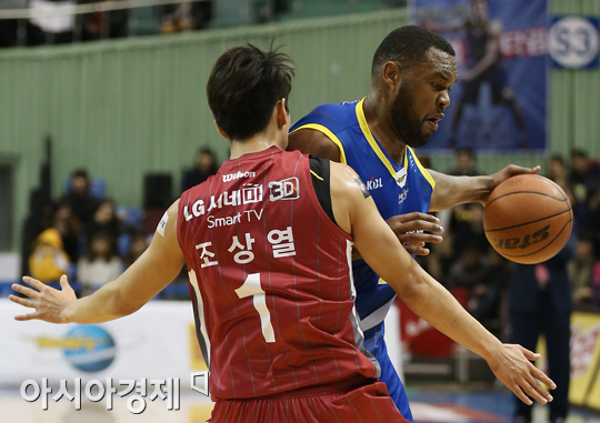 [아시아경제 정재훈 기자] 27일 오후 서울 잠실실내체육관에서 열린 KB국민카드 2013~2014 프로농구 삼성과 LG의 경기. 삼성 존슨이 LG 조상열의 수비를 받고 있다.