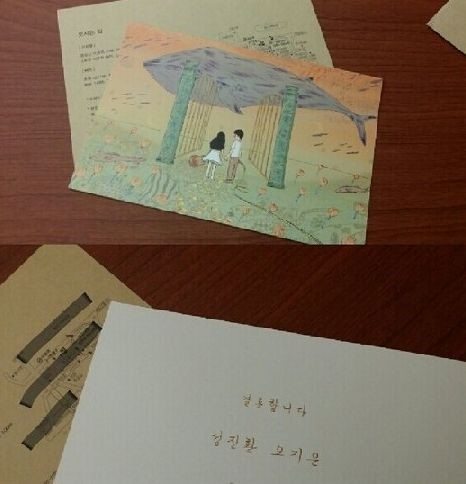 사진 속 청첩장에는 큰 고래를 앞에 두고 남녀가 손을 잡고 있는 일러스트가 담겨있다. 또 다른 사진에는 손글씨로 '결혼합니다. 성진환 오지은' 글이 적혀 있어 눈길을 끈다.
