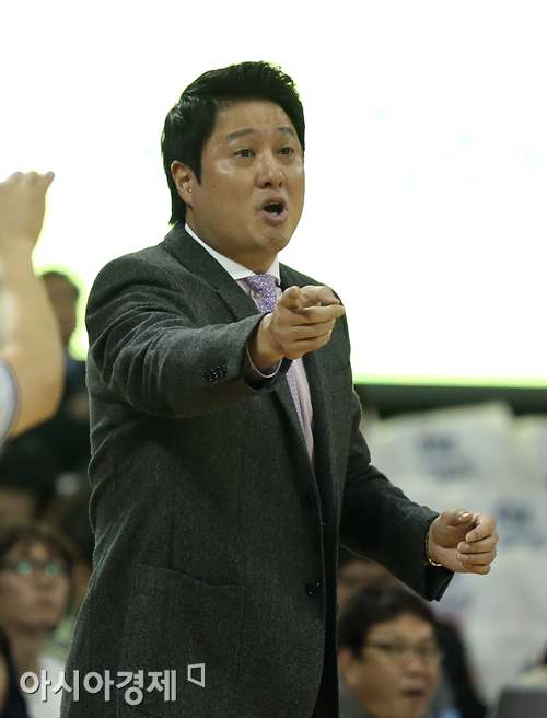 [아시아경제 정재훈 기자] 3일 오후 서울 잠실학생체육관에서 열린 KB국민카드 2013~2014 프로농구 SK와 동부의 경기. SK 문경은 감독이 지시를 내리고 있다.