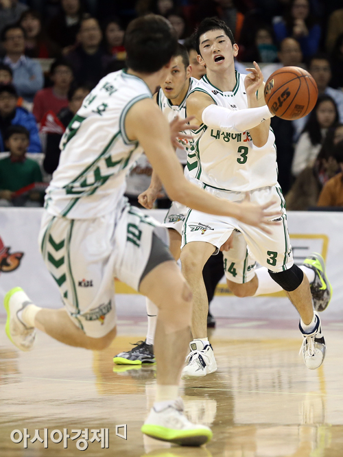 [아시아경제 정재훈 기자] 3일 오후 서울 잠실학생체육관에서 열린 KB국민카드 2013~2014 프로농구 SK와 동부의 경기. 동부 박병우가 역습 찬스에서 김현호에게 패스를 건네고 있다.