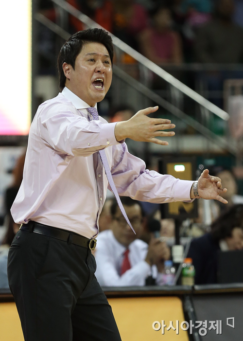[아시아경제 정재훈 기자] 3일 오후 서울 잠실학생체육관에서 열린 KB국민카드 2013~2014 프로농구 SK와 동부의 경기. SK 문경은 감독이 선수들에게 지시를 내리고 있다.