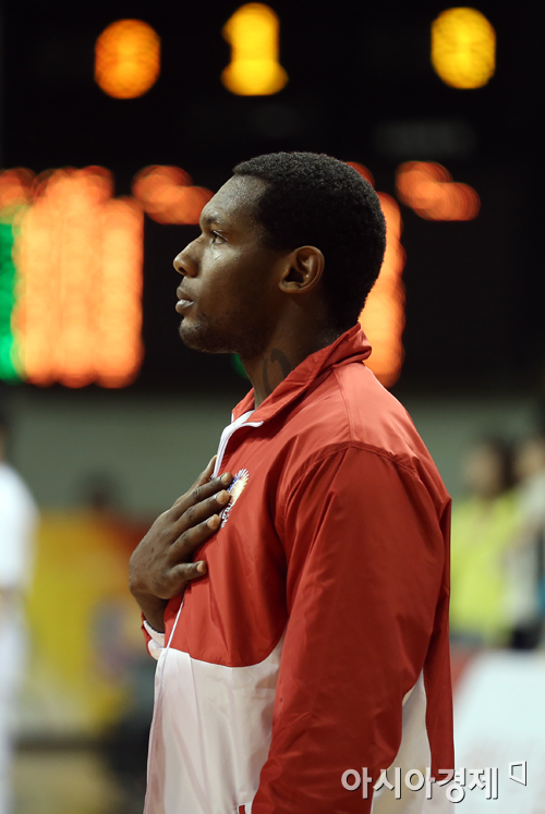 [안양=아시아경제 정재훈 기자] 4일 오후 안양실내체육관에서 열린 KB국민카드 2013~2014 KGC와 삼성의 경기. KGC 맥키네스가 가슴에 손을 얹고 국민의례를 하고 있다.