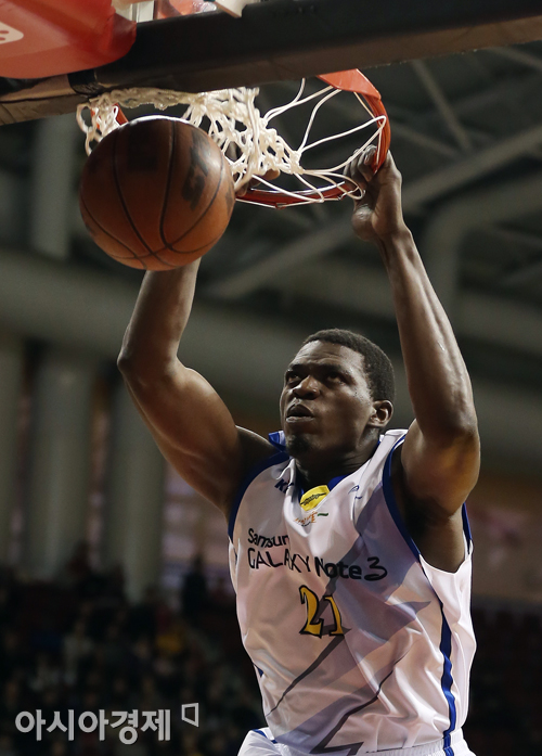 [안양=아시아경제 정재훈 기자] 4일 오후 안양실내체육관에서 열린 KB국민카드 2013~2014 KGC와 삼성의 경기. 삼성 마이클 더니건이 덩크슛을 시도하고 있다.