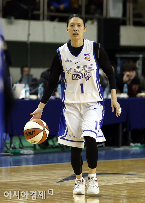 [춘천=아시아경제 정재훈 기자] 5일 오후 강원도 춘천 호반체육관에서 열린 우리은행 2013∼2014 여자프로농구’ 올스타전. 우리동네 예체능 연예인 농구팀과 WKBL 레전드팀의 오프닝 경기에서 전주원이 공을 드리블하고 있다.