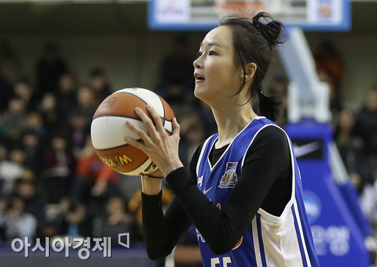 [춘천=아시아경제 정재훈 기자] 5일 오후 강원도 춘천 호반체육관에서 열린 우리은행 2013∼2014 여자프로농구’ 올스타전. 우리동네 예체능 연예인 농구팀과 WKBL 레전드팀의 오프닝 경기에서 이혜정이 슛을 하고 있다.