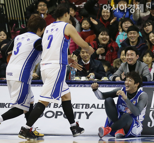 [춘천=아시아경제 정재훈 기자] 5일 오후 강원도 춘천 호반체육관에서 열린 우리은행 2013∼2014 여자프로농구’ 올스타전. 우리동네 예체능 연예인 농구팀과 WKBL 레전드팀의 오프닝 경기에서 김혁이 파울을 당해 넘어져 웃고 있다.