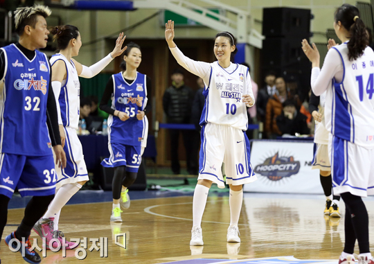 [춘천=아시아경제 정재훈 기자] 5일 오후 강원도 춘천 호반체육관에서 열린 우리은행 2013∼2014 여자프로농구’ 올스타전. 우리동네 예체능 연예인 농구팀과 WKBL 레전드팀의 오프닝 경기를 마친 박정은이 동료들과 하이파이브를 하고 있다.