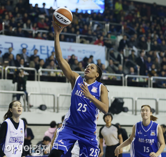 [춘천=아시아경제 정재훈 기자] 5일 오후 강원도 춘천 호반체육관에서 열린 우리은행 2013∼2014 여자프로농구’ 올스타전. 남부선발 모니크 커리가 슛을 시도하고 있다.
