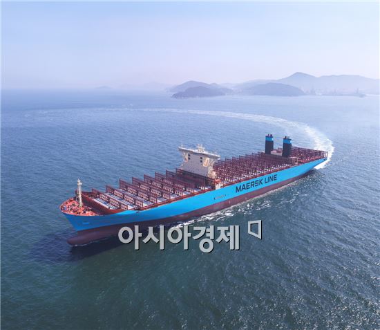 지난해 세 개의 잡지에서 올해 최우수 선박으로 선정된 덴마크 A.P.Moller-Maersk 社의 1만 8270 TEU 컨테이너선인 ‘머스크 맥키니 몰러(Maersk Mc-Kinney Moller)’호의 모습.(사진제공=대우조선해양)