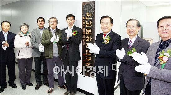 [아시아경제 노해섭 기자]박준영 전남도지사와 최성락 한국고고학회장, 임영진 백제학회장, 박중환 국립나주박물관장, 정광덕 전남문화예술재단 사무처장 등이 8일 오후 무안군 삼향읍 전남개발공사 빌딩 4층에서 열린 전남문화재연구소 개소식에서 현판 한 후 박수를 치고 있다. 사진제공=전남도