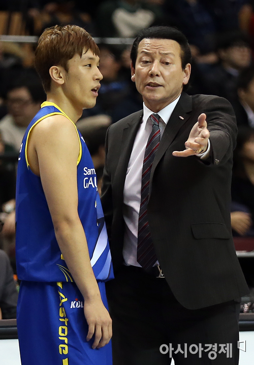 [아시아경제 정재훈 기자] 8일 오후 서울 잠실실내체육관에서 열린 KB국민카드 2013~2014 프로농구 삼성과 오리온스의 경기. 삼성 김동광 감독이 박재현을 불러놓고 지시를 내리고 있다.