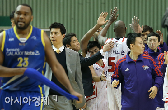 [아시아경제 정재훈 기자] 8일 오후 서울 잠실실내체육관에서 열린 KB국민카드 2013~2014 프로농구 삼성과 오리온스의 경기. 78:72 승리를 거둔 오리온스 선수들이 기쁨을 나누고 있다.