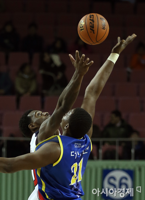 [아시아경제 정재훈 기자] 10일 오후 서울 잠실실내체육관에서 열린 'KB국민카드 2013~2014 프로농구' 삼성과 모비스의 경기. 삼성 더니건과 모비스 라틀리프가 점프볼을 다투고 있다.