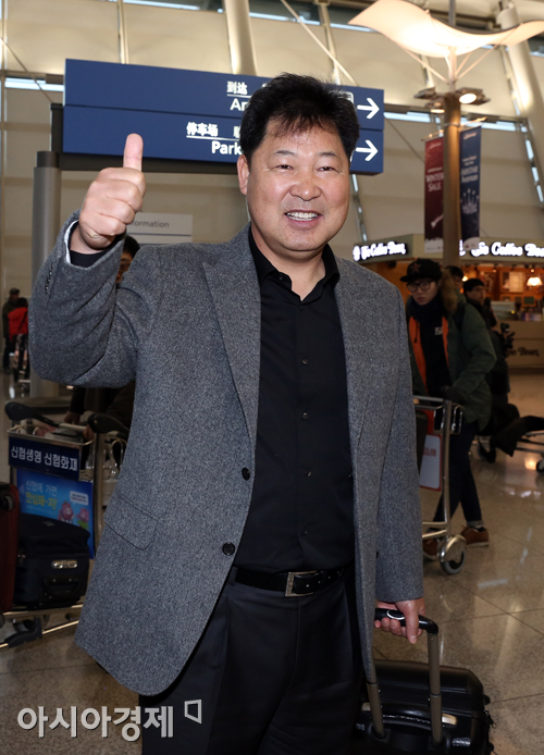 [인천=아시아경제 정재훈 기자] 미국 플로리다로 전지훈련을 떠나는 SK 와이번스 이만수 감독이 15일 오전 인천국제공항에서 출국에 앞서 취재진을 향해 엄지손가락을 들고 있다.