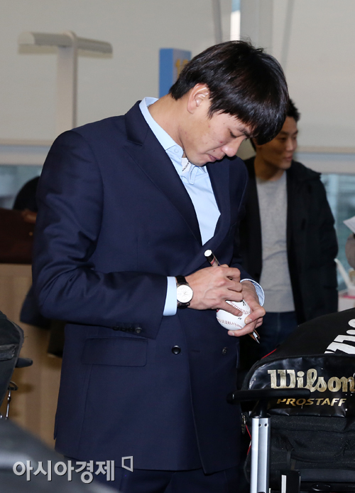 [인천=아시아경제 정재훈 기자] 미국 플로리다로 전지훈련을 떠나는 SK 와이번스 김광현이 15일 오전 인천국제공항에서 출국에 앞서 팬의 사인 요청에 응하고 있다.
