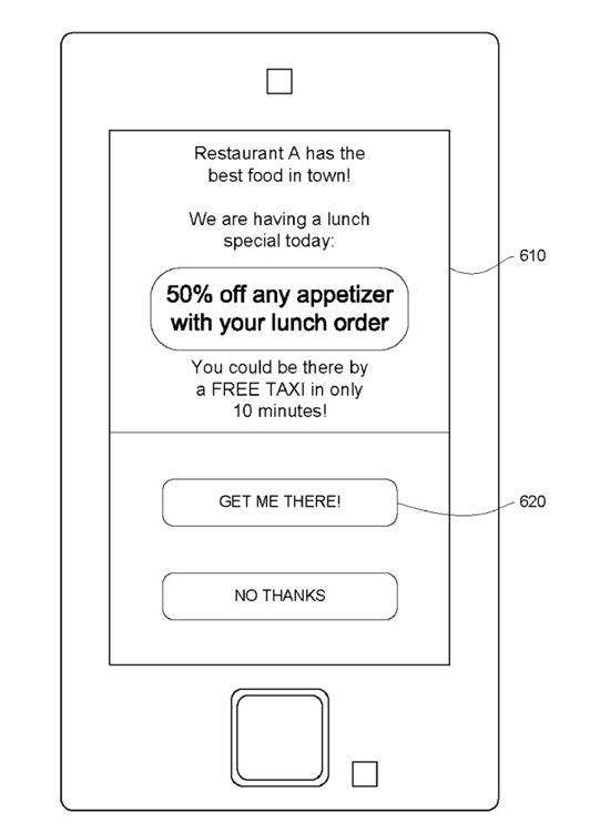 스마트폰이나 공공장소에 설치된 터치스크린 광고판에서 특정 업체가 발행한 쿠폰이 발급되고, 신분확인·동행자·현위치·서비스 이용 기록 등의 정보를 파악해 택시가 예약된다. 외신들은 이 특허로 점주들의 가장 큰 고민거리였던 '손님 끌어오기'가 어느 정도 해결될 수 있을 것으로 예상했다.