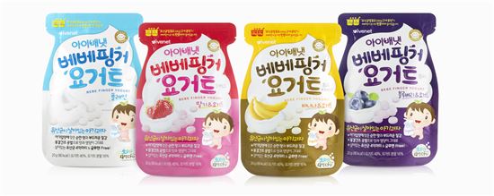 아이배냇 베베핑거요거트는 바나나&요거트, 딸기&요거트, 블루베리&요거트, 프레인&요거트로 구성돼 있다.