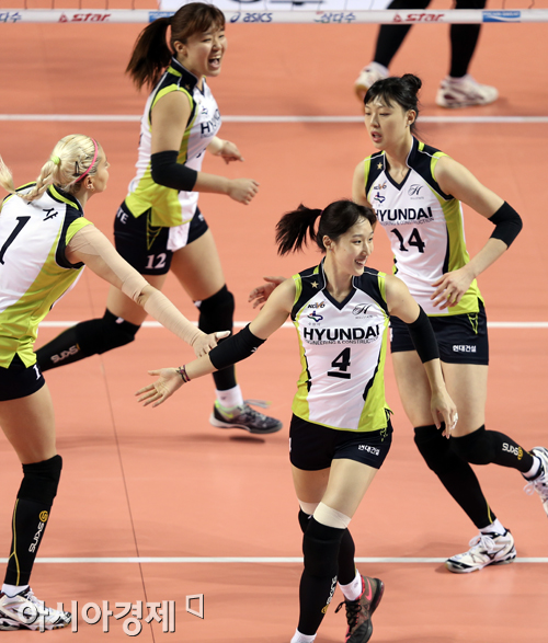 [화성=아시아경제 정재훈 기자] 29일 오후 화성실내체육관에서 열린 NH농협 2013~2014 V리그 여자부 IBK기업은행과 현대건설의 경기. 현대건설 황연주가 득점에 기뻐하고 있다.