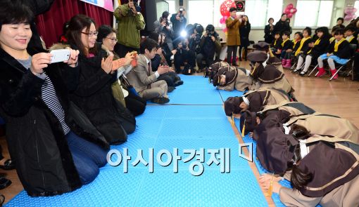 [아시아경제 최우창 기자]19일 서울 광진구 구의2동 주민센터에서 '구의2동 민간 어린이집 졸업식'이 열린 가운데 졸업생 어린이들이 부모님에게 감사의 절을 하고 있다.