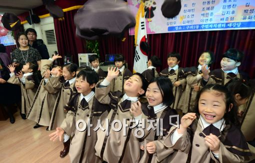[아시아경제 최우창 기자]19일 서울 광진구 구의2동 주민센터에서 '구의2동 민간 어린이집 졸업식'이 열린 가운데 졸업생들이 학사모를 던지고 있다.