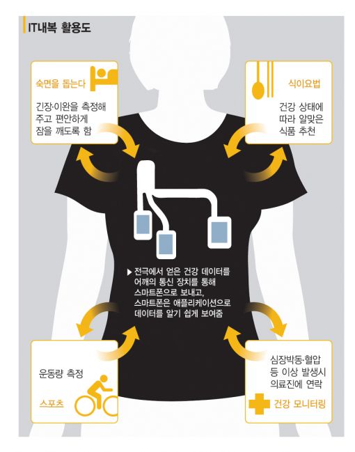 패치는 심전도계의 전극 역할을 하며 패치가 연결돼 어깨 부위에 부탁된 작은 기기는 심박 수를 스마트폰에 보낸다. 스마트 셔츠를 입은 사람은 스마트폰에 관련 애플리케이션을 내려받아 심박 수를 수치와 스크린에 나타난 파동 모양으로 확인할 수 있다.