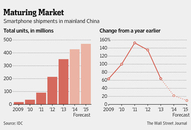 현재 중국 휴대폰 사용 인구 10억명 가운데 40% 이상이 스마트폰을 사용하고 있어 실질적 포화상태에 가까워졌다고 전했다.