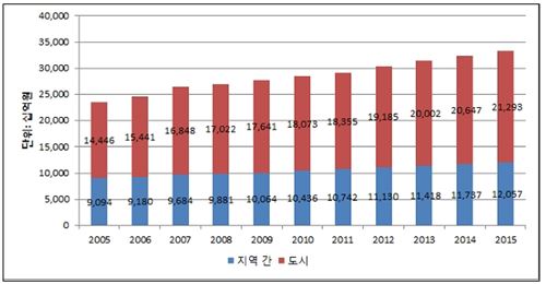 도시부 도로의 교통혼잡비용은 전체의 63.8%인 21조3433억원이었다. 고속국도·일반국도·지방도 등 지역간 도로의 교통혼잡비용은 12조567억원(36.2%)으로, 일반국도의 교통혼잡비용(5조6398억원)이 절반 가까이 됐다. 연평균 증가율로 보면 도시부 도로가 3.96%로 지역간 도로(2.86%)보다 높았다.