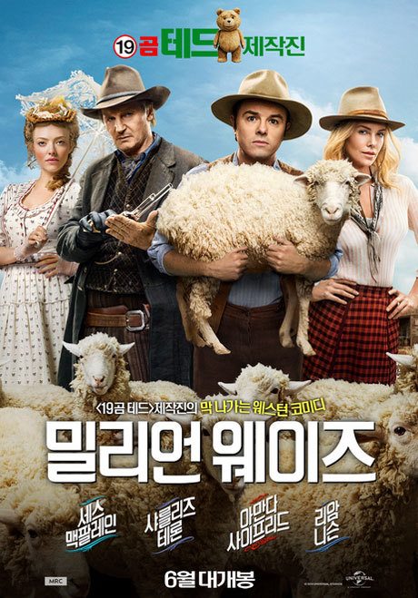 여기에 심각해 보이지만 왠지 모르게 웃음을 유발하는 표정으로 양을 안고 있는 세스 맥팔레인, 카우보이 모자를 쓰고 시크하게 응시하고 있는 샤를리즈 테론, 이와는 대조적으로 화려한 의상에 고고한 자태를 뽐내고 있는 아만다 사이프리드와 서부의 사나이를 연상시키는 리암 니슨은 보는 이들의 호기심을 자극한다.