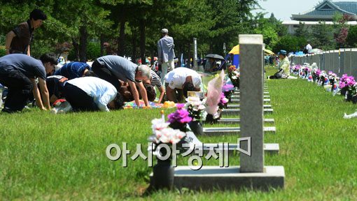 [아시아경제 백소아 기자] 제59회 현충일인 6일 서울 동작구 국립현충원에서 한 참배객들이 추모하고 있다.
