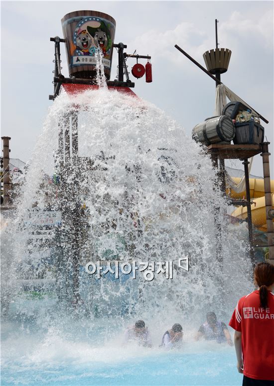 [포토]더위엔 시원한 폭포수가 최고여~ 때른 무더위가 기승을 부리는 가운데 주말인 7일 전남 나주중흥골드스파 리조트를 찾은 관광객들이 물폭탄을 맞으면소 더위를 식히고 있다.