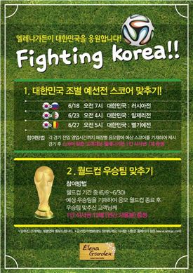 이벤트 참여방법은 대표팀의 각 경기 전일 영업시간까지 엘레나가든 이용 후 응모지에 예상 스코어 및 우승팀을 기재해 제출하면 된다. 경기 종료 후 스코어를 맞춘 고객에게 엘레나가든 1인 식사권 1매 증정하며 월드컵 종료 후 우승팀을 맞춘 고객에게는 추첨을 통해 1인 식사권 12매 증정한다.