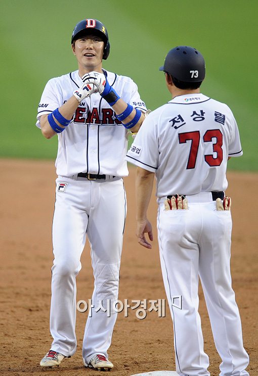 [아시아경제 김현민 기자]18일 오후 서울 잠실구자에서 열린 2014 프로야구 LG 트윈스와 두산 베어스의 경기, 3회말 2사 1루에서 두산 민병헌이 중전안타를 치고 전상렬 코치와 하이파이브를 나누고 있다.