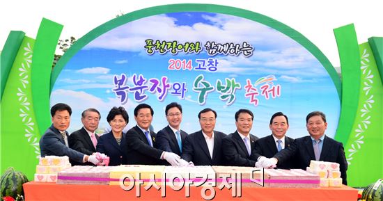 풍천장어와 함께하는 2014 고창복분자와 수박축제가 20일부터 22일까지 3일간 선운산 도립공원에서 성황리에 열렸다. 이날 이강수 고창군수 등 참석자들이 개막을 축하하는 떡케익을 자르고 있다.