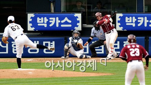 [아시아경제 김현민 기자]29일 서울 잠실구장에서 열린 프로야구 넥센 히어로즈와 두산 베어스의 경기, 7회초 무사 2루에서 넥센 유한준이 추가 1타점 적시타를 치고 있다.