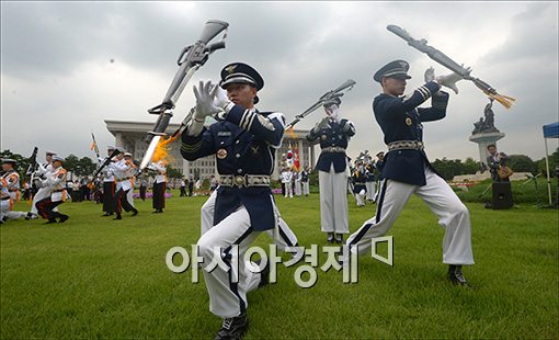 [아시아경제 윤동주 기자] 17일 서울 여의도 국회 앞 잔디마당에서 열린 국회비전선포식과 세월호 슬픔을 함께 하기 위한 공연에서 군 의장대가 멋진 총검술 시범을 보이고 있다.