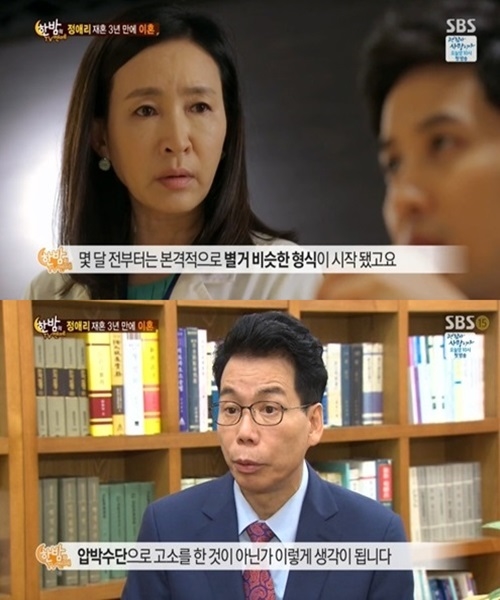23일 방송된 SBS '한밤의 TV 연예'에서는 배우 정애리와 민들레영토 지승룡 대표의 이혼과 피소 관련 내용이 전해졌다.