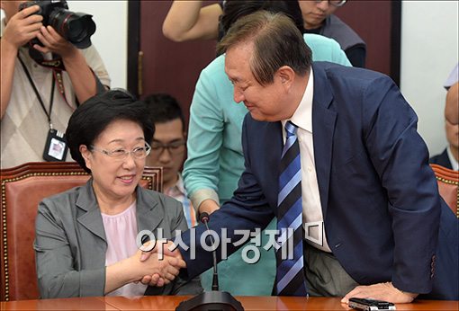 [아시아경제 윤동주 기자] 1일 서울 여의도 국회에서 열린 새정치민주연합 '비대위 구성 관련 단위별 비상 상임고문단 회의'에 참석한 한명숙 상임고문과 정대철 상임고문이 인사를 나누고 있다.
