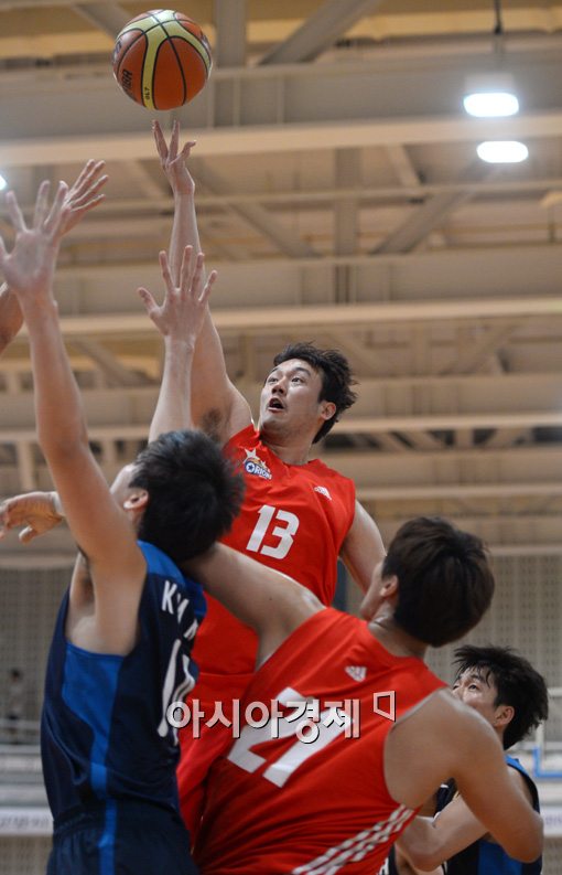 [고양=아시아경제 김현민 기자] 12일 오후 고양체육관 보조경기장에서 열린 프로농구 고양 오리온스와 18세 이하 남자농구 국가대표팀과의 연습경기에서 오리온스 김동욱이 대표팀의 수비를 뚫고 슛을 시도하고 있다.