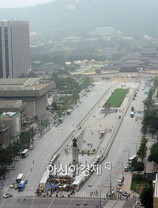 [아시아경제 백소아 기자] 민방위훈련이 실시된 20일 서울 세종로 도로에 차량들이 훈련이 끝나기를 기다리고 있다.