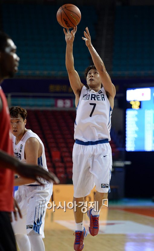 [인천=아시아경제 김현민 기자] 아시안게임 농구 국가대표팀 김태술이 18일 인천 삼산월드체육관에서 열린 외국인선수연합팀과의 연습경기에서 슛하고 있다.