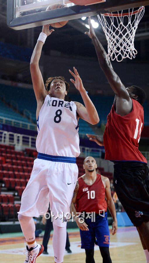[인천=아시아경제 김현민 기자] 아시안게임 농구 국가대표팀 이종현이 18일 인천 삼산월드체육관에서 열린 외국인선수연합팀과의 연습경기에서 슛하고 있다.