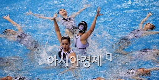 [인천=아시아경제 김현민 기자] 23일 인천 문학박태환수영장에서 열린 2014 인천아시안게임 싱크로나이즈드스위밍 여자 프리콤비네이션 결승전에서 마카오 대표팀이 연기를 펼치고 있다.
