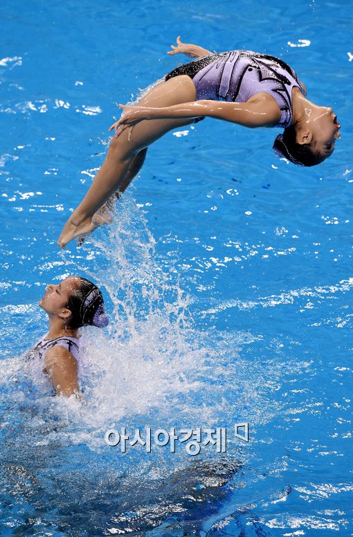 [인천=아시아경제 김현민 기자] 23일 인천 문학박태환수영장에서 열린 2014 인천아시안게임 싱크로나이즈드스위밍 여자 프리콤비네이션 결승전에서 마카오 대표팀이 연기를 펼치고 있다.