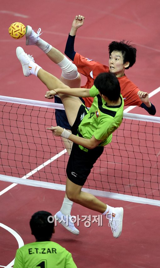 [부천=아시아경제 김현민 기자] 여자 세팍타크로 김이슬이 24일 부천체육관에서 열린 2014 인천아시안게임 미얀마와의 단체 예선 B조 4경기에서 공격하고 있다.