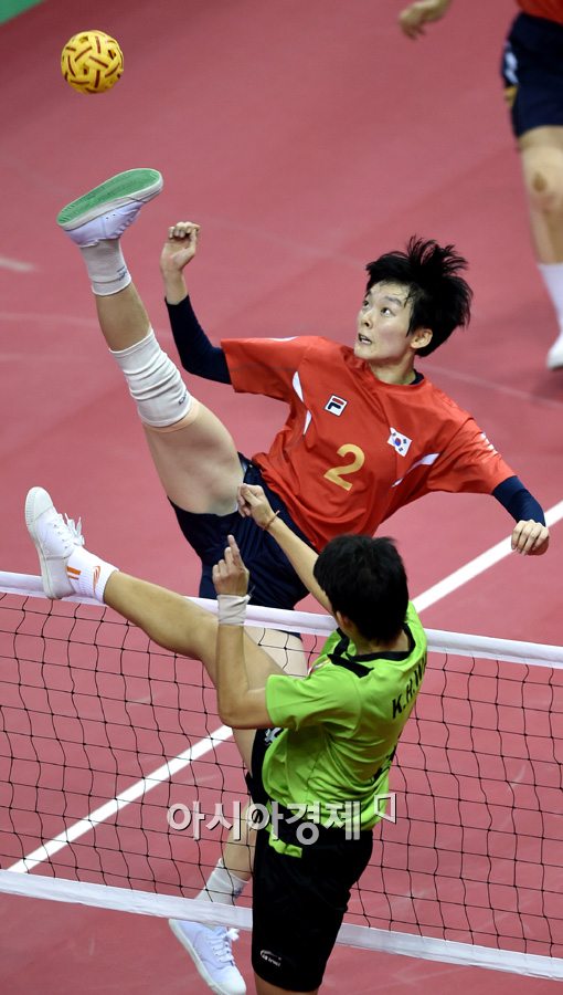 [부천=아시아경제 김현민 기자] 여자 세팍타크로 김이슬이 24일 부천체육관에서 열린 2014 인천아시안게임 미얀마와의 단체 예선 B조 4경기에서 공격하고 있다.