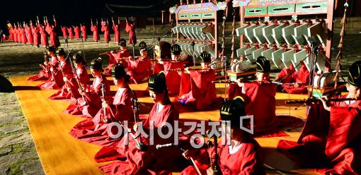 [아시아경제 최우창 기자] 25일 오후 서울 종묘 정전에서 종묘제례악 야간공연 리허설이 펼쳐지고 있다.