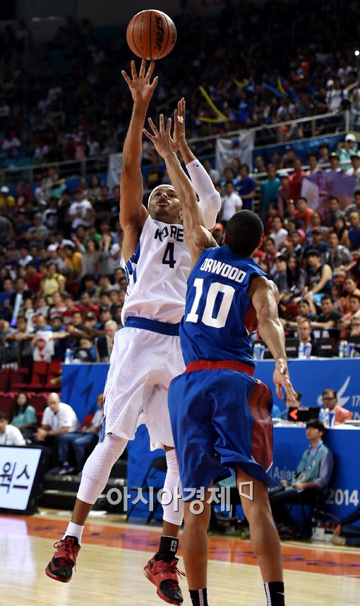 [안산=아시아경제 김현민 기자] 남자 농구 국가대표팀 문태종이 27일 인천 삼산월드체육관에서 열린 아시안게임 필리핀과의 8강 라운드 H조 3경기에서 수비를 뚫고 슛하고 있다.