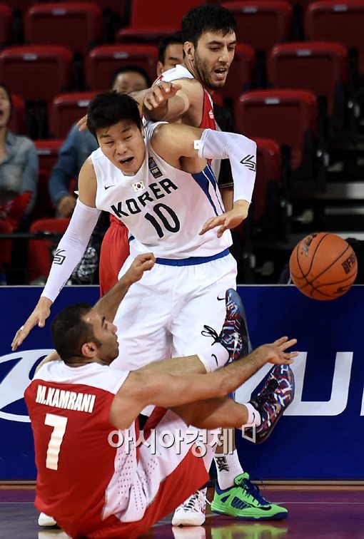 [인천=아시아경제 김현민 기자] 아시안게임 남자 농구대표팀 조성민이 3일 인천 삼산월드체육관에서 열린 이란과의 결승전에서 상대와 리바운드를 다투고 있다.